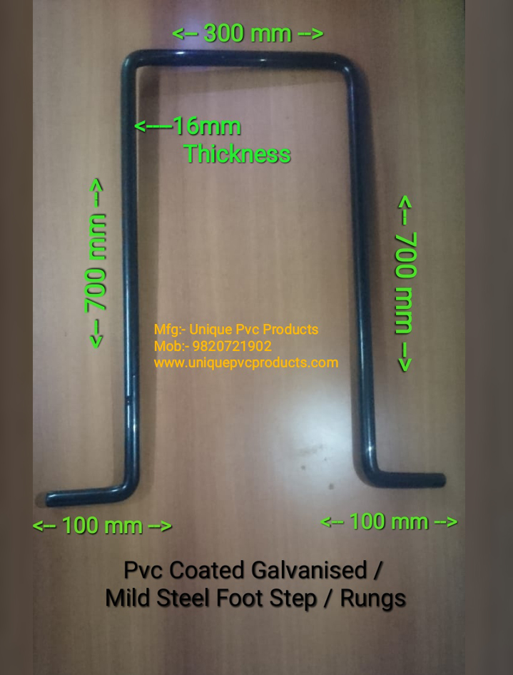 Our Rungs are specially designed & made for water, chemicals & acid plants, It is 100% water, chemical & acid proof, It does not rust and is non-corrosive, made with solid 16 / 18 / 20 & 25 m.m. mild steel rod & PVC coating in 300 degrees of heat. A specially designed handle of 100 m.m. length on both sides will goes inside the concrete wall with 200 mm remaining outside. The final size of the rungs 300 x 300 x 100 = 1100 m.m and can hold more than 150 Kgs & can easily be fixed in concrete wall.